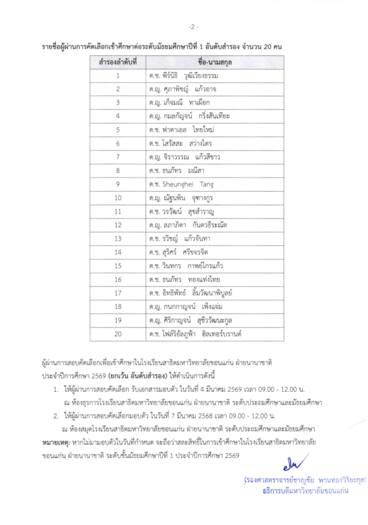 วันพุธที่ 4 มีนาคม 2569 ; ผู้ผ่านการสอบคัดเลือก (ตัวจริง) รับเอกสารมอบตัว เวลา 09.00 – 12.00 น. ณ ห้องธุรการ รร.สาธิตฯ ฝ่ายนานาชาติ